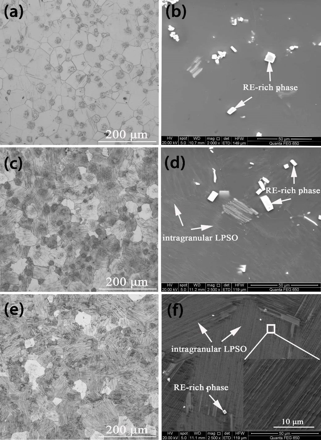 圖1 不同冷卻速率下固溶態(tài)Mg–10Gd–1Er–1Zn–0.6Zr合金的OM (a, c, e)和SEM (b, d, f)圖像,(a, b)水冷,(c, d)空冷,(e, f)爐冷