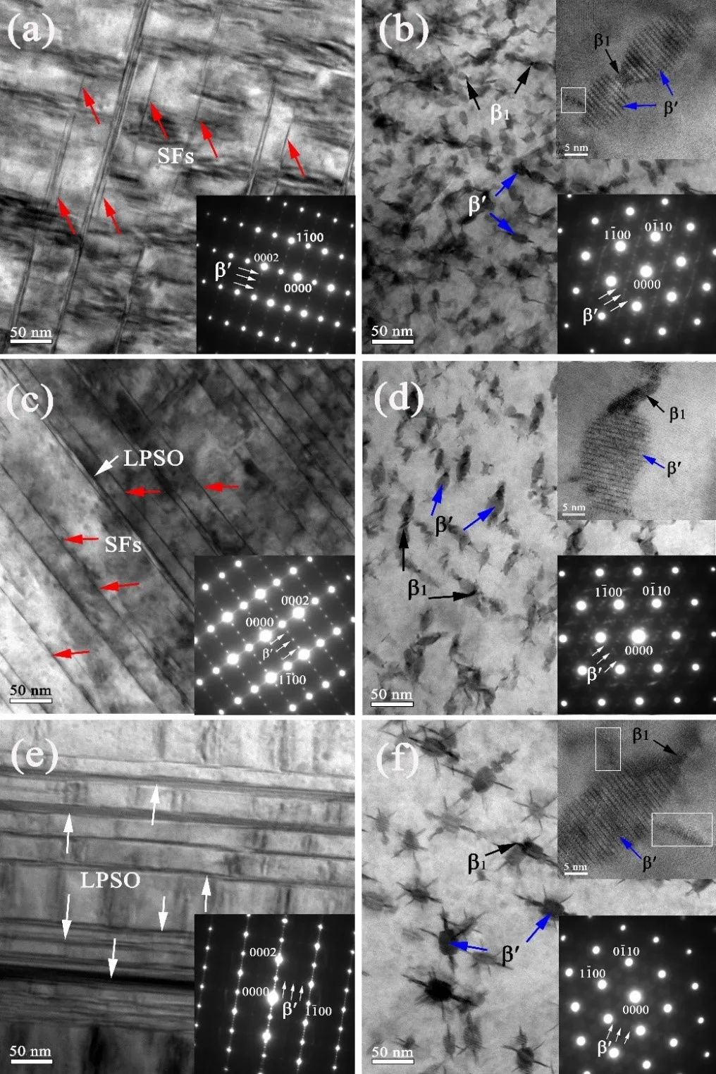 重點(diǎn)研究了基面析出相-LPSO相、層錯(cuò)與柱面析出相-β′相的相互作用關(guān)系,結(jié)果如圖3所示。獲得細(xì)小且彌散分布的β′相是高強(qiáng)韌鎂合金的主