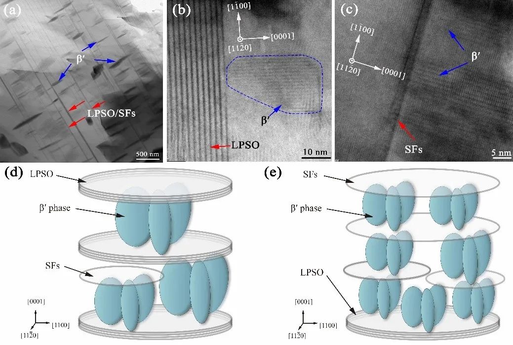 圖3 LPSO相、層錯(cuò)以及β′相的分布及形貌(a, b, c)以及三種強(qiáng)化相間的強(qiáng)化模型(d, e)