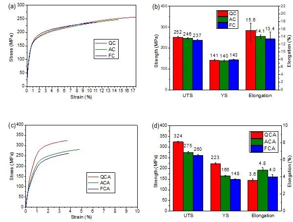 圖4 不同冷卻速率下固溶態(tài)與時(shí)效態(tài)合金室溫力學(xué)性能,(a, b)固溶態(tài)合金,(c, d)時(shí)效態(tài)合金