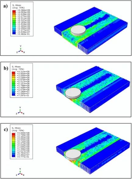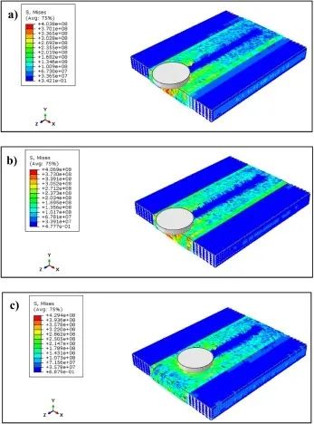 圖2 在900 rpm的恒定轉(zhuǎn)速和不同轉(zhuǎn)速下焊接試樣中的殘余應(yīng)力場分布(未預(yù)熱):(a)50 mm/min(b)100 mm/min和(c)150 mm/min