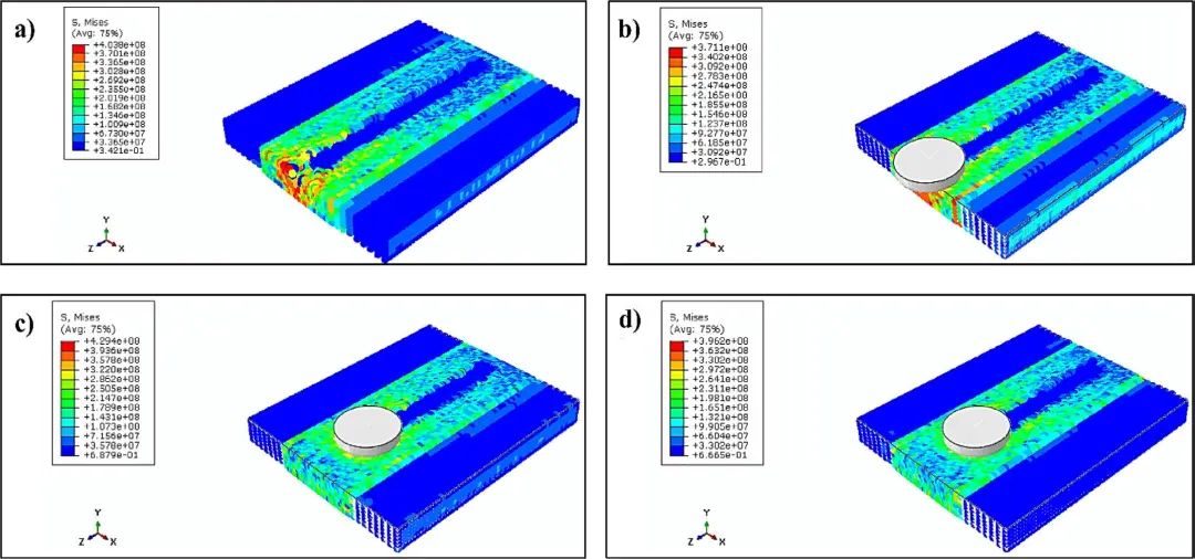 圖3 不同工藝條件下攪拌摩擦焊試樣的殘余應(yīng)力場分布:(a)轉(zhuǎn)速600 rpm、焊接速度100 mm/min、未預(yù)熱;(b)轉(zhuǎn)速600 rpm、焊接速度100 mm/min、預(yù)熱;(c)轉(zhuǎn)速1200 rpm、焊接速度150 mm/min、未預(yù)熱;(d)轉(zhuǎn)速1200 rpm、焊接速度150 mm/min