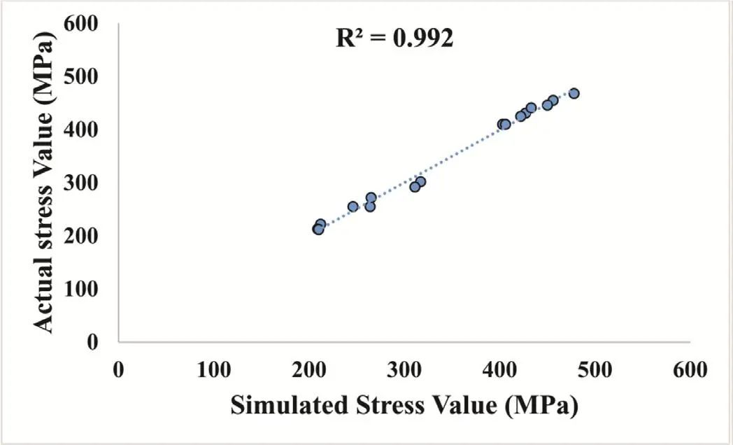 自適應(yīng)神經(jīng)模糊推理系統(tǒng)(ANFIS)是一種具備自適應(yīng)學(xué)習(xí)能力和基于邏輯規(guī)則推理的高性能計算模型。通過構(gòu)建該模型并不斷優(yōu)化,輸入預(yù)定轉(zhuǎn)速、焊接速度、預(yù)熱和焊縫中心距離,模擬焊接參數(shù)對殘余應(yīng)力的影響規(guī)律。在合理范圍內(nèi)隨機選取16組模擬數(shù)據(jù)結(jié)果,與實驗數(shù)據(jù)進行比較以評估模型的準確度,擬合結(jié)果如圖4所示,表明該模型的精確度較高。