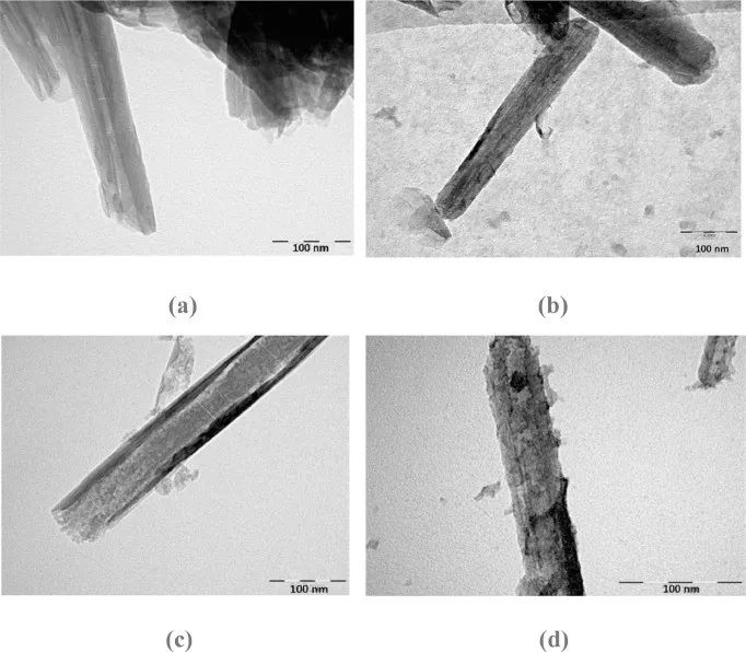 圖1 TEM圖像:(a)HNTs,(b)抑制劑負(fù)載的HNTs,(c)EHNTs和(d)抑制劑負(fù)載的EHNTs