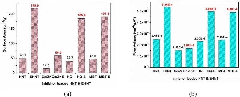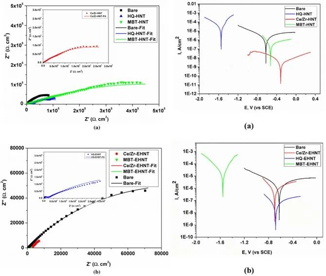 近日,來自印度粉末冶金與新材料國際研究中心的R. Subasri博士等人利用埃洛石納米管(HNTs)和刻蝕后的埃洛石納米管(EHNTs)作為納米容器,分別負(fù)載了Ce3+-Zr4+、2-巰基苯并噻唑(MBT)和8-羥基喹啉(HQ)等緩蝕劑,對比研究了HNTs和EHNTs中不同緩蝕劑分子的負(fù)載釋放動力學(xué)。研究結(jié)果表明,在3.5 wt.% NaCl水溶液中浸泡120小時后,Ce3+-Zr4+-HNTs涂層的電化學(xué)阻抗Rct值為4.464×107 Ω·cm2,自腐蝕電流密度最低,為2.667×10-9 A/cm2,表現(xiàn)出最好的腐蝕防護(hù)能力;通過對HNTs和EHNTs釋放的緩蝕劑進(jìn)行定量分析,發(fā)現(xiàn)Korsmeyer-Peppas模型最符合緩蝕劑的釋放動力學(xué)過程。