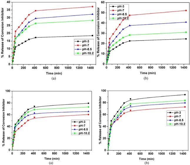 本文還探索了HNTs和EHNTs中不同緩蝕劑的釋放速率。負(fù)載在HNTs和EHNTs中的Ce3+-Zr4+及HQ在不同pH值NaCl水溶液中的釋放速率曲線如圖4所示,初期緩蝕劑的釋放百分比隨時間而增加,隨后達(dá)到穩(wěn)定狀態(tài)。無論HNTs和EHNTs負(fù)載了HQ或是Ce3+-Zr4+,EHNTs在任一pH值下的釋放百分比均更高,這可能與刻蝕后的EHNTs管腔能夠負(fù)載更多的緩蝕劑有關(guān)。研究還發(fā)現(xiàn)Ce3+-Zr4+的釋放百分比在pH為7時最高,在pH為3時最低,這可能是由于此時Ce3+-Zr4+形成了MAA絡(luò)合物,緩蝕劑釋放量減少。