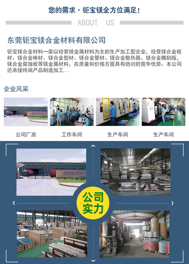 東莞市鉅寶鎂合金材料有限公司是一家專業(yè)從事鎂合金系列產(chǎn)品的研發(fā)、生產(chǎn)、銷售為一體的企業(yè),多年來,在同行業(yè)和消費者的心中了贏得非常值得信賴的口碑,本司主要產(chǎn)品有:鎂合金板、鎂合金管、鎂合金棒、鎂合金型材、鎂豆、鎂絲、蝕刻板、雕刻板、及鎂合金機加工產(chǎn)品,主要應(yīng)用于:航天、軍工、軌道、交通、新能源汽車、智能制造、3C等各種領(lǐng)域,我司的產(chǎn)品暢銷美、歐、日、韓等各國,另外我司還通過了ISO9001:2015國際質(zhì)量管理體系認(rèn)證,擁有規(guī)范和完善的質(zhì)量體系,公司秉承“誠信、專業(yè)、共贏”的經(jīng)營理念,堅持用戶至上,以優(yōu)質(zhì)的服務(wù)來服務(wù)好每一位客戶,堅持技術(shù)上不斷創(chuàng)新、不斷超越,用我們的優(yōu)質(zhì)服務(wù)以及專業(yè)技術(shù)為客戶提供產(chǎn)品的后續(xù)表面處理及售后服務(wù)。