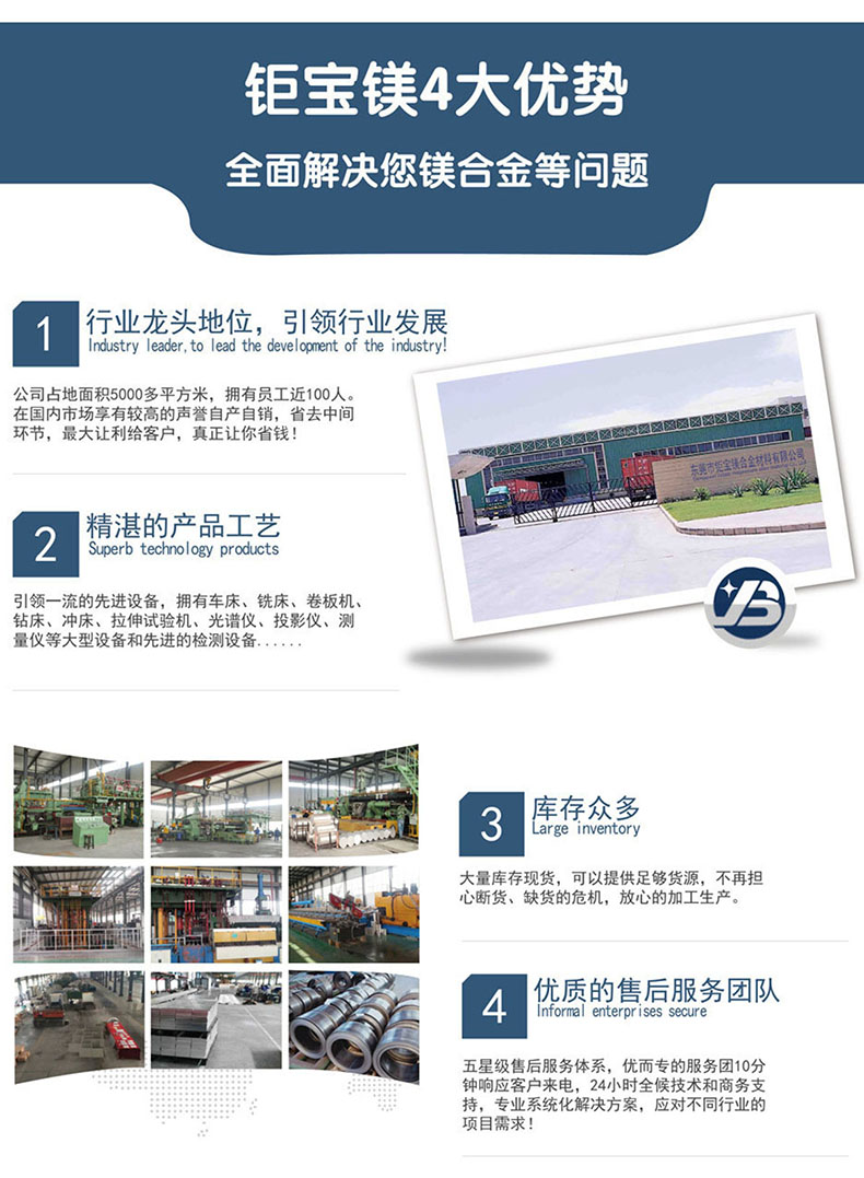 東莞市鉅寶鎂合金材料有限公司是一家專業(yè)從事鎂合金系列產(chǎn)品的研發(fā)、生產(chǎn)、銷售為一體的企業(yè),多年來,在同行業(yè)和消費(fèi)者的心中了贏得非常值得信賴的口碑,本司主要產(chǎn)品有:鎂合金板、鎂合金管、鎂合金棒、鎂合金型材、鎂豆、鎂絲、蝕刻板、雕刻板、及鎂合金機(jī)加工產(chǎn)品,主要應(yīng)用于:航天、軍工、軌道、交通、新能源汽車、智能制造、3C等各種領(lǐng)域,我司的產(chǎn)品暢銷美、歐、日、韓等各國,另外我司還通過了ISO9001:2015國際質(zhì)量管理體系認(rèn)證,擁有規(guī)范和完善的質(zhì)量體系,公司秉承“誠信、專業(yè)、共贏”的經(jīng)營理念,堅(jiān)持用戶至上,以優(yōu)質(zhì)的服務(wù)來服務(wù)好每一位客戶,堅(jiān)持技術(shù)上不斷創(chuàng)新、不斷超越,用我們的優(yōu)質(zhì)服務(wù)以及專業(yè)技術(shù)為客戶提供產(chǎn)品的后續(xù)表面處理及售后服務(wù)。